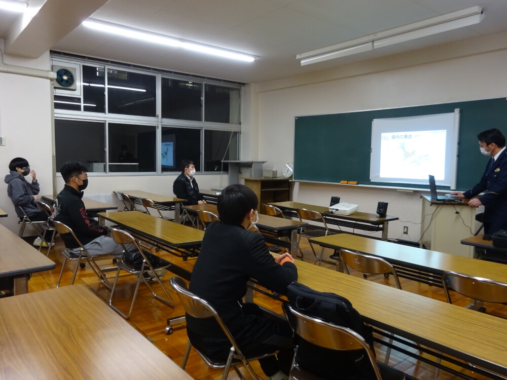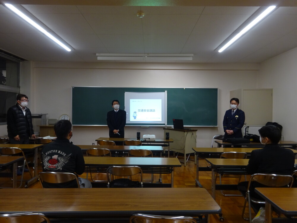 山梨県立都留高等学校定時制 > 活動の様子 > 学校行事 > 交通講話 2022年12月22日カテゴリー: 活動の様子 学校行事 交通講話 大月警察署交通課の古屋さんを講師にお迎えして、12月21日(水)に交通講話が行われました。自分たちの生活圏で実際に起きた交通事故の例をたくさん挙げながらお話しいただいたので、1人1人が真剣に耳を傾けていました。生徒代表としてお礼の言葉を述べた渡邊くんは「身近で起きた具体的な事故の画像を見ながら聴けたので、とてもわかりやすかったです。」と話していました。参加者全員が生命の尊さを噛みしめ、交通ルールを遵守していこうという決意を新たにしていました。