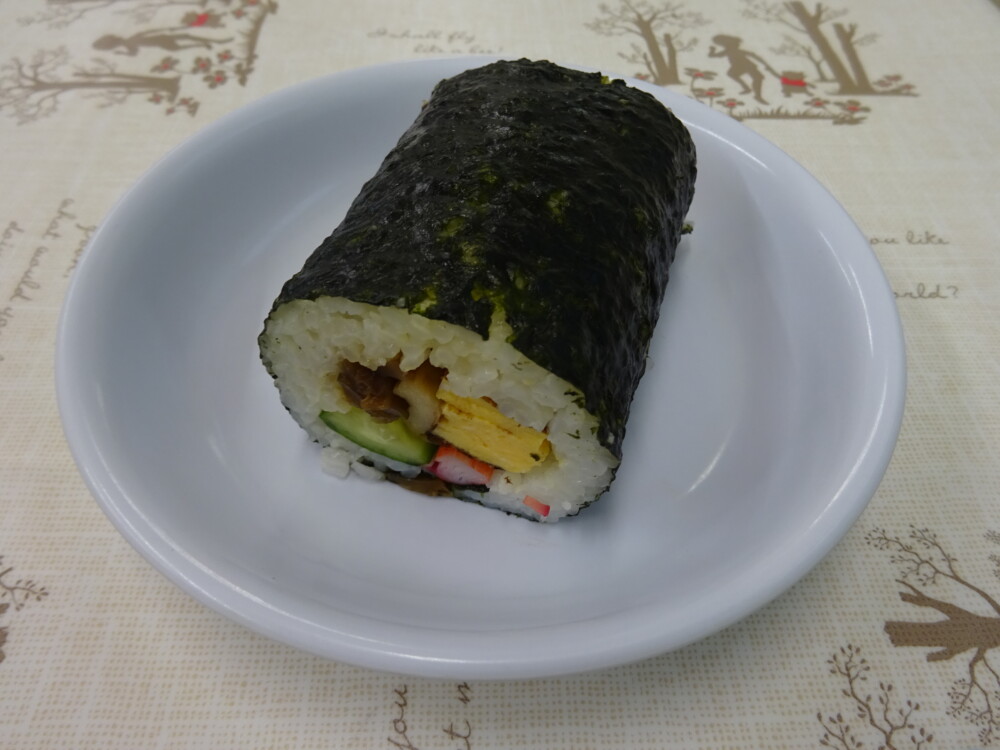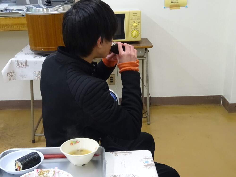 山梨県立都留高等学校定時制 > 活動の様子 > 学校の様子 > 節分の恵方巻 2023年2月6日カテゴリー: 活動の様子 学校の様子 節分の恵方巻 昨年7月に本校の給食献立例を御紹介しましたが、覚えていらっしゃる方も多いかと思います。2月3日(金)には、調理員の大家さんが毎年恒例の恵方巻を作ってくださいました。今年の恵方、南南東に向かって思い思いに願い事をしながら、皆で黙々といただきました。大家さんの愛情たっぷりの給食にパワーをもらい、生徒一同は今日も勉学に励みました。