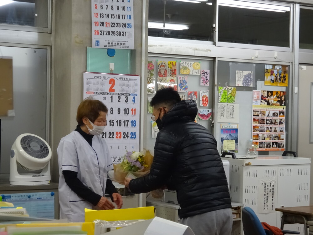 山梨県立都留高等学校定時制 > 活動の様子 > 給食調理員さんへの花束贈呈 2023年2月27日カテゴリー: 活動の様子 給食調理員さんへの花束贈呈 巣立ちの日が近づきつつある2月15日(水)に、4年次生が給食調理員さんに花束贈呈を行いました。4年間、雨の日も風の日も愛情たっぷりの美味しい給食を作ってくださった調理員さんに、心からの感謝を込めて贈りました。