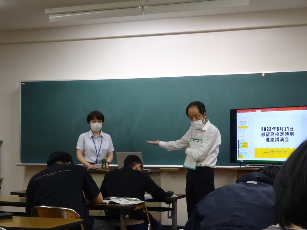 山梨県立都留高等学校定時制 > 活動の様子 > 学校行事 > 職業適性検査フィードバック講演会 2023年6月22日カテゴリー: 活動の様子 学校行事 職業適性検査フィードバック講演会 4月19日(水)に実施した職業適性検査と進路希望調査に基づき、職業適性検査フィードバック講演会が行われました。適性検査結果票の見方について説明を受けた後、学習の意義や高校時代に身につけておきたい能力、就職試験の概要、進学に伴う費用等について詳しく学びました。講師の先生から、自らの職業体験も踏まえながら「自分の頭で考える習慣」の大切さを語っていただきました。生徒会長がお礼の挨拶として「短時間で非常にわかりやすく説明していただき、自分の進路が見えてきました」と述べ、終了後のアンケートでも1人1人が丁寧に回答していました。 。