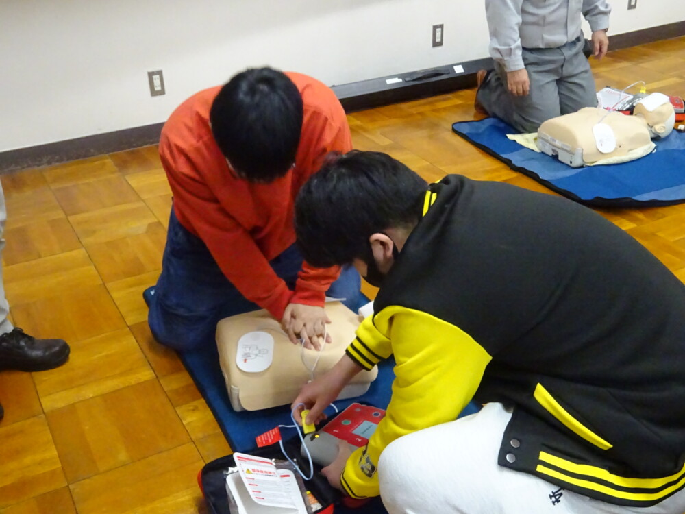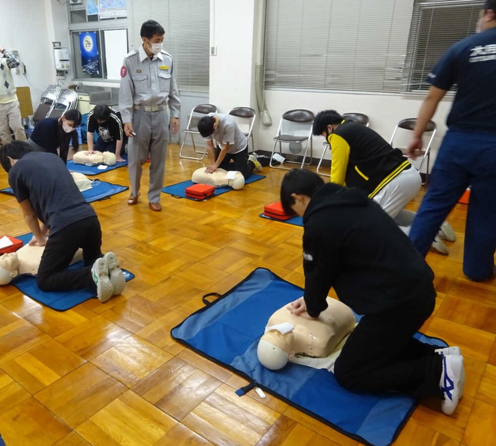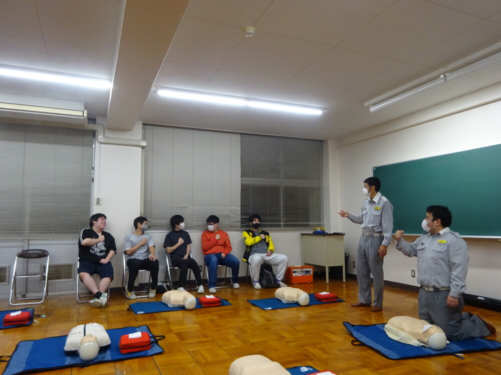 山梨県立都留高等学校定時制 > 活動の様子 > 学校行事 > 救急救命法講習 2024年10月31日カテゴリー: 活動の様子 学校行事 救急救命法講習 10月28日(月)には救急救命法講習が行われました。大月消防署の講師が「一番大切なことは、現場にいる人が救急車到着まで心臓の圧迫を続けることです。校内のAED設置場所もしっかり確認しておきましょう」と呼びかけました。周囲の状況と意識の有無の確認、AEDと救急車の手配、たくさんの人を呼んで交代で心臓を圧迫することなど、一問一答形式で学びました。生徒も積極的に質問しながら心肺蘇生法の訓練に臨みました。生徒代表がお礼の言葉として「実際の緊急時に生かせるように、今日学んだことを身に付けておきたいと思います」と述べました。