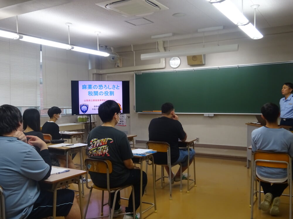 山梨県立都留高等学校定時制 > 活動の様子 > 学校行事 > 税関教室「麻薬の恐ろしさと税関の役割について」 2025年7月24日カテゴリー: 活動の様子 学校行事 税関教室「麻薬の恐ろしさと税関の役割について」 7月16日(水)に薬物乱用防止教室が開催されました。「不正薬物の恐ろしさ」「どういうことに気をつけたらよいか」「税関の役割」等について東京税関山梨政令派出所所属の講師からお話を聴きました。「密輸クイズ」等も取り入れたわかりやすい内容で、生徒や職員から多くの質問が寄せられ、その1つ1つに丁寧にお答えいただきました。生徒代表が「税関が日本の安全を守っていることや薬物の恐ろしさを知ることができました」とお礼の言葉を述べました。