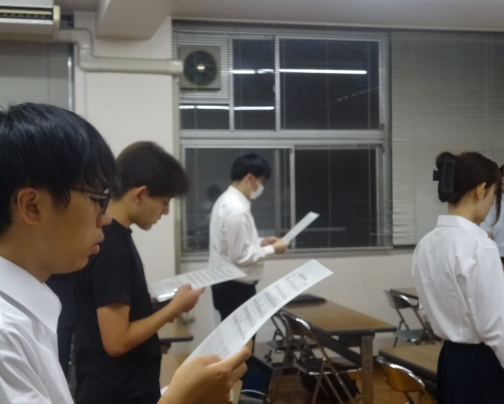 8月25日(月)に夏休み明けの全校集会が行われました。全員で校歌斉唱した後、教頭が「これからの4ヶ月間は学園祭や教育祭、定期試験や英語検定、文章検定等、イベントが盛り沢山です。今の自分の力にプラス1くらいの目標を立ててがんばりましょう」と呼びかけました。生徒たちは、生活面、学習面それぞれについて各自で目標を立て、配布された用紙に記入していました。