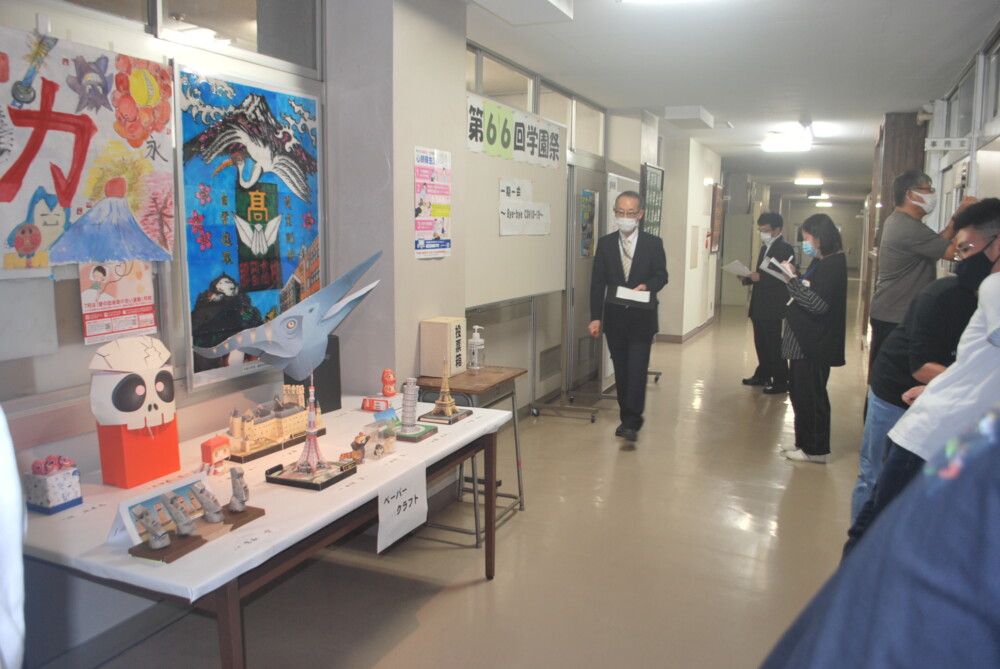 その後文化作品(ペーパークラフト・刻字・絵手紙)の展示を見学し、お互いに採点をしあいました。