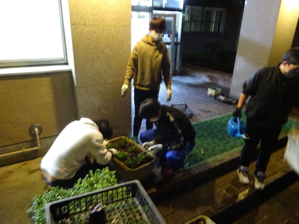 11月8日(月)、正面玄関前でパンジー・ビオラの苗をプランターに移植しました。
