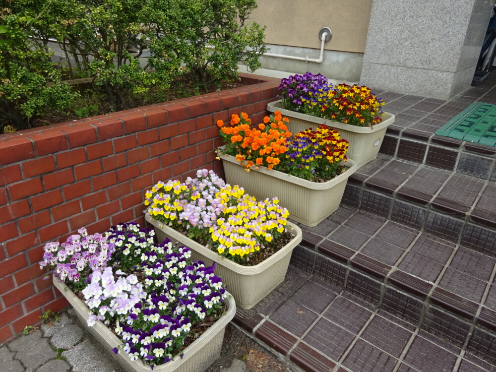 県のキャリアビジョン形成支援事業の一環として、毎年植花作業を実施しています。昨年11月に皆で植えたプランター8個分52株のビオラが、本校正面玄関で今まさに満開の状態です。今年の冬は例年になく厳しかったのですが、霜や雪、乾燥によく耐えてくれました。こまめに水遣りと花殻摘みを行うと、6月中旬まで花を愛でることができます。